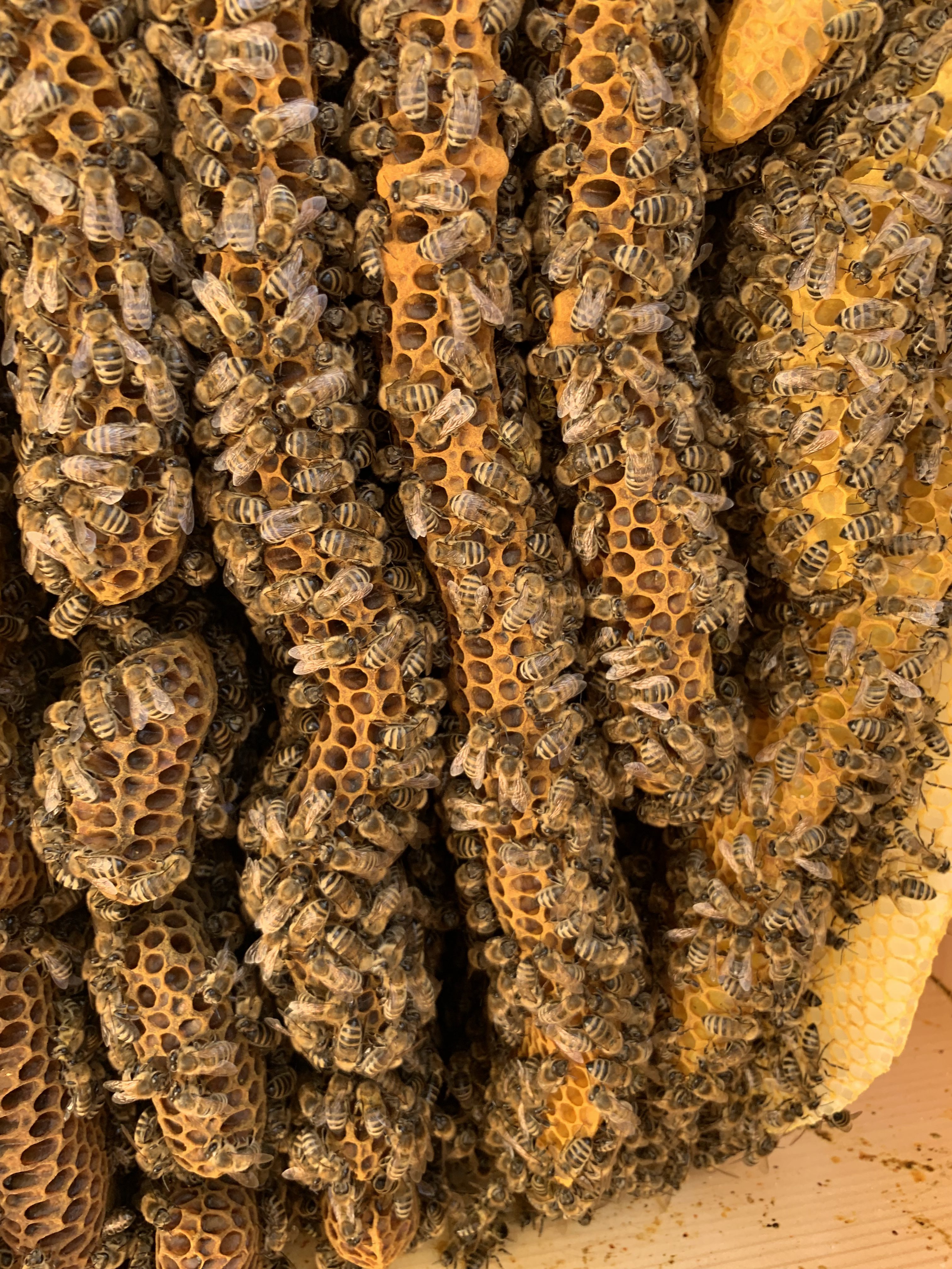 Polly ist auf jeden Fall sehr gut über den Winter gekommen, wie sich in den Tagen zuvor schon erahnen ließ. Die Kiste ist zu gut drei viertel ausgebaut und voll mit Bienen die fleißig arbeiten. Es gibt verdeckelte Brut, was anzeigt, dass es auch der Königin gut geht. Jetzt braucht es nur nich einen schönen warmen Frühling, damit das Bienenjahr gut startet.